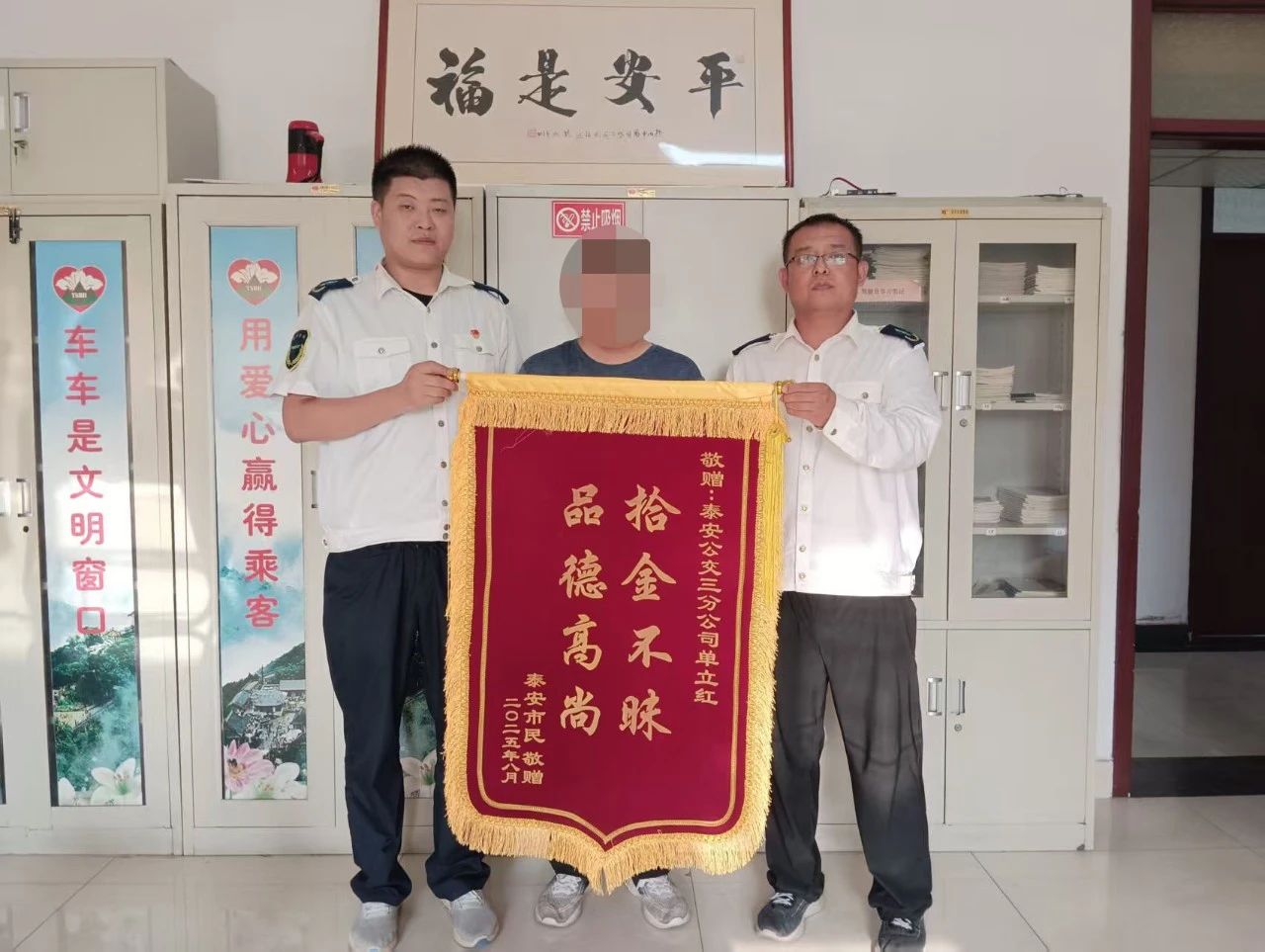 8月15日,泰城市民李女士的家人將一面寫(xiě)有“拾金不昧 品德高尚”的錦旗送到泰安公交第三分公司,向7路公交駕駛員單立紅表達誠摯感謝,感謝其撿到李女士遺失的手機后妥善保管并歸還。
